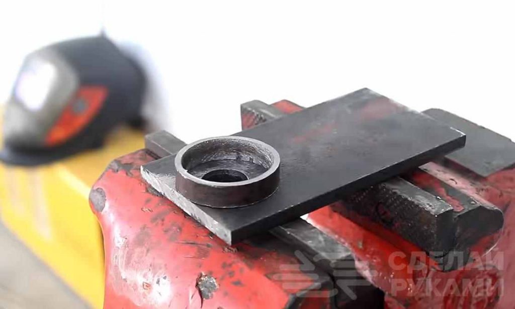 Первым делом необходимо отрезать металлическую пластину прямоугольной формы толщиной около 10 мм. В ней нужно просверлить отверстие, а потом приварить кольцо из трубы.
