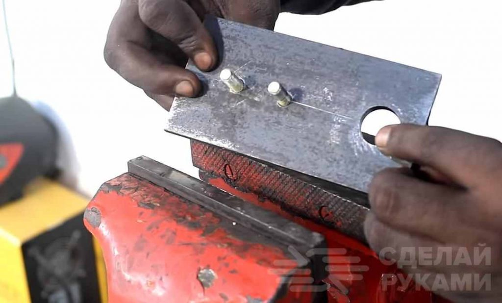 Далее по центру заготовки автор сверлит еще два отверстия, но меньшего диаметра. В них нужно вставить болты, а затем обварить.