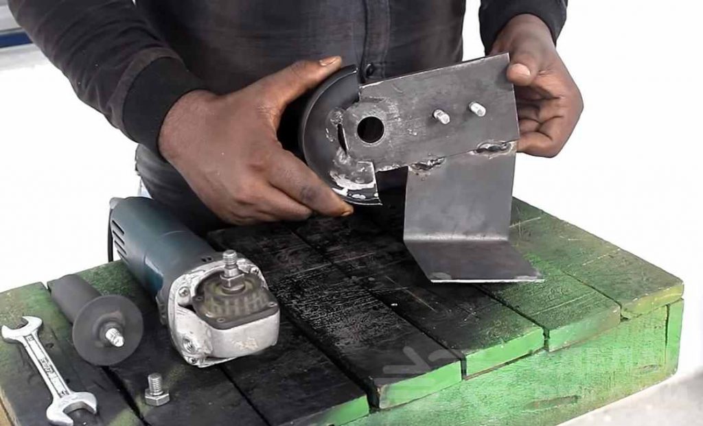 После этого получившуюся «насадку» необходимо закрепить на корпусе редуктора УШМ. Одно крепление фиксируется с помощью ручки, второе — болтом.