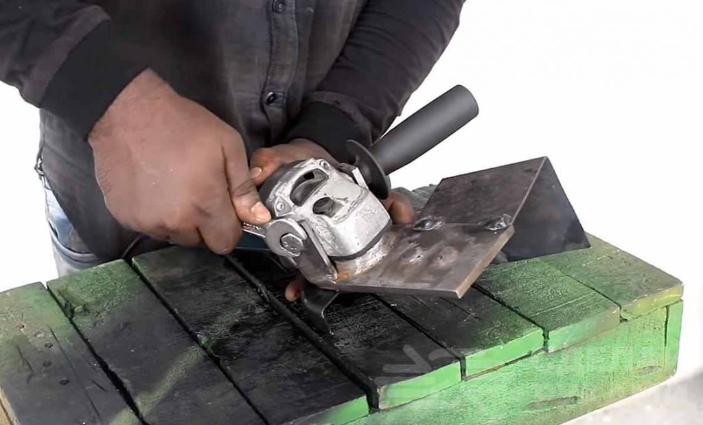 На следующем этапе к пластине приваривается часть кожуха от болгарки и кусок листового металла Г-образной формы. На другой стороне пластины автор приваривает два куска полосы с отверстиями.