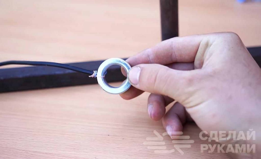 К профильной трубе автор приваривает перпендикулярно отрезок круглой трубы, чтобы удобно было удерживать приспособление в руках. Конец провода нужно привязать к гайке или кольцу.