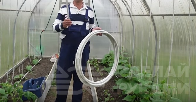 Труба продаётся в скрученном виде, поэтому на грядке её нужно будет зафиксировать. Небольшие металлические крючки должны иметь достаточную длину, чтобы плотно входить в грунт.