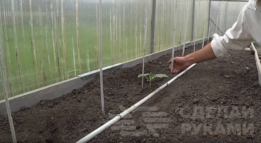 Трубу располагайте по линии посадки, чтобы полив шёл непосредственно под корень. Если растения будут высажены в два ряда, нет смысла класть трубу между ними.