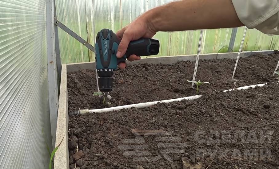Удобно проделывать отверстия тогда, когда растения уже высажены в грунт. Так вода будет поступать точно под каждый куст.