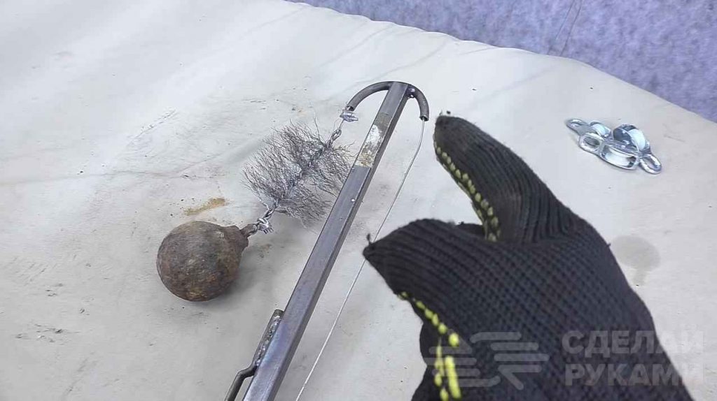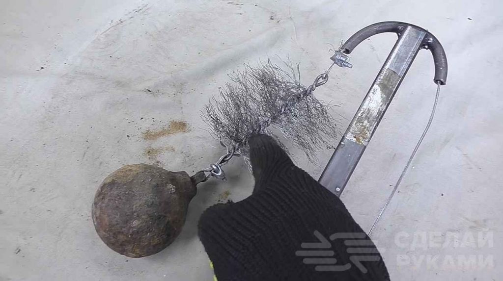 Из основных материалов для изготовления самоделки потребуется кусок трубки из стали диаметром примерно 10 мм, отрезок профильной трубы, часть гантели, ершик для чистки дымоходов и металлический тросик.
