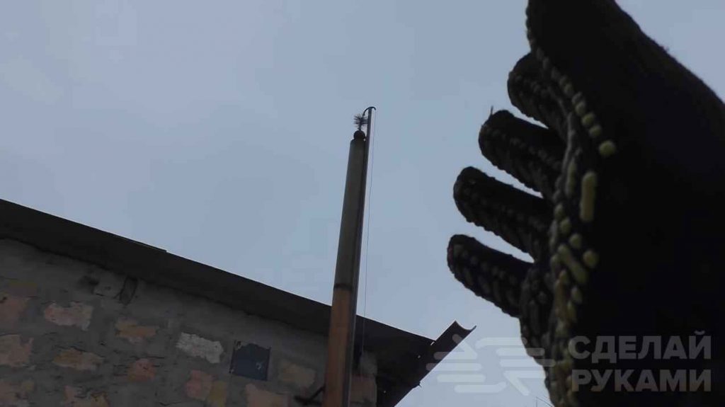Профильная труба крепится к дымоходу, а при помощи троса выполняется чистка внутренних стенок от налипшей сажи. Это намного удобнее, чем ставить лестницу, чтобы забраться на крышу (или чистить дымоход с самой лестницы).