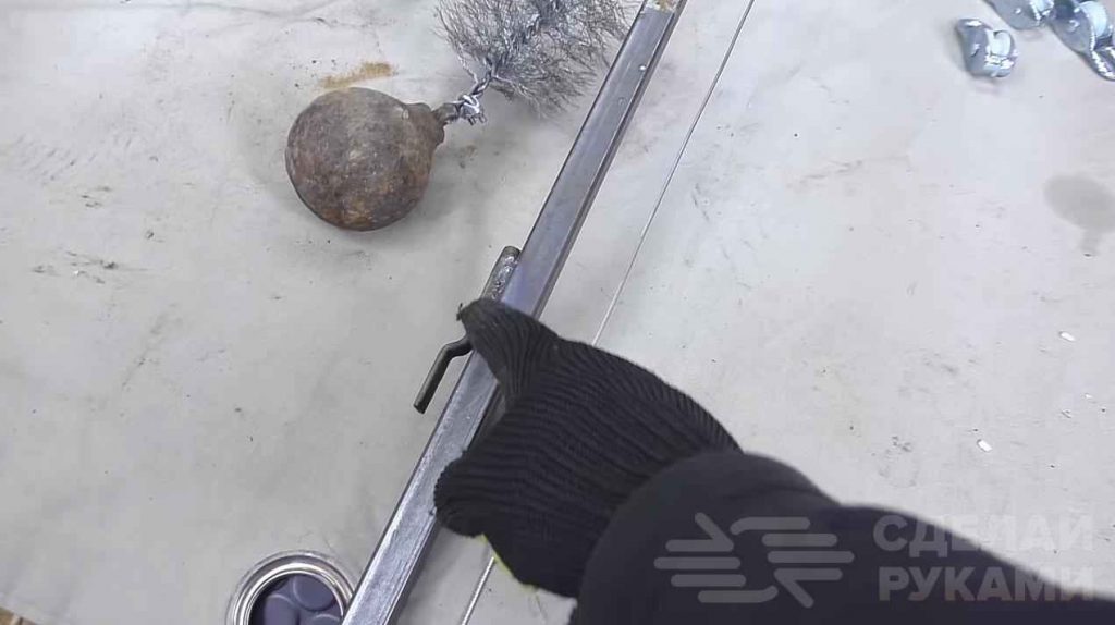 Кстати, профиль используется сечением 20*20 мм, длина — 3,5 метра. Внутрь трубки диаметром 10 мм необходимо пропустить металлический тросик, на конце которого надо закрепить самодельный ершик и часть гантели.