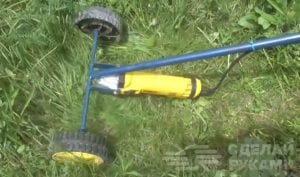 На завершающем этапе работ необходимо «насадить» на триммер колеса и установить болгарку, надежно зафиксировав ее болтами. После этого останется только продеть в отверстия быстрозажимной гайки кусок стального троса и прикрутить ее на вал угловой шлифовальной машины.