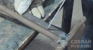 С другой стороны стальных пластин необходимо сделать небольшие углубления при помощи болгарки или на заточном станке. Затем полученные заготовки нужно прикрутить к корпусу болгарки болтами, а к ним приварить длинный отрезок стального прута круглого сечения.