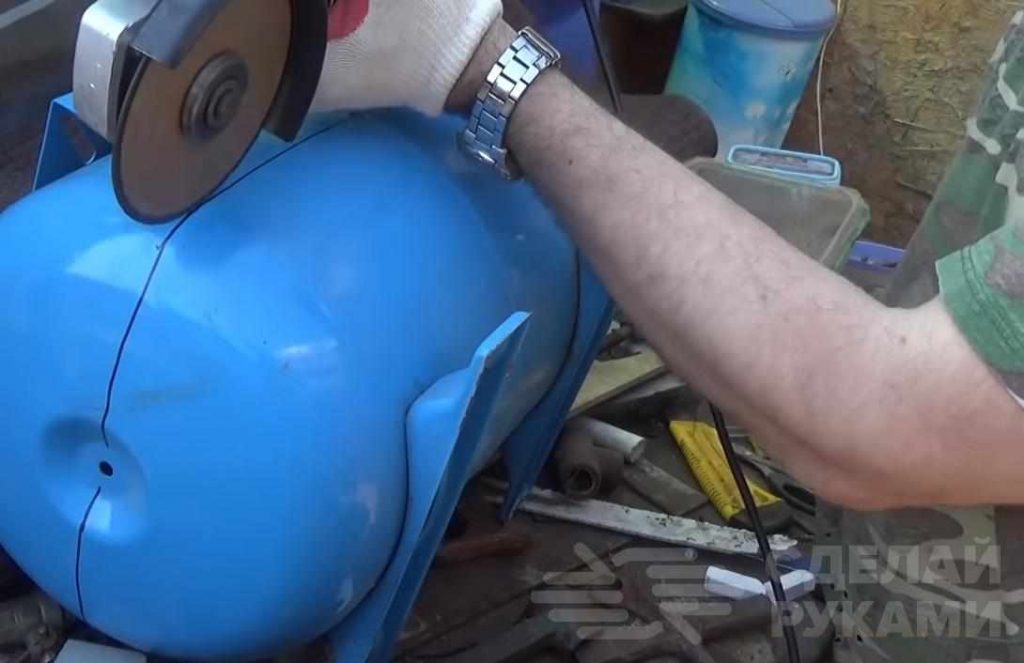 Первым делом необходимо маркером начертить линию, по которой нужно будет сделать рез болгаркой. То есть, задача простая — разрезать баллон на две половинки.