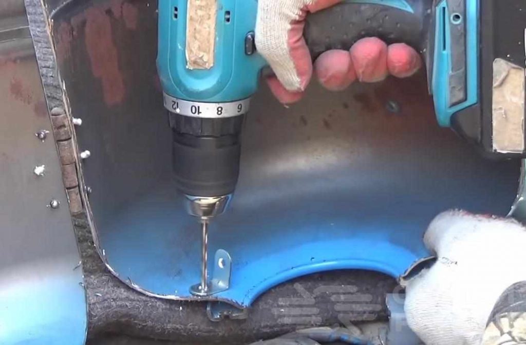 К нижней половине корпуса с внутренней стороны мастер крепит на заклепки четыре уголка. На них будет опираться металлическая решетка.
