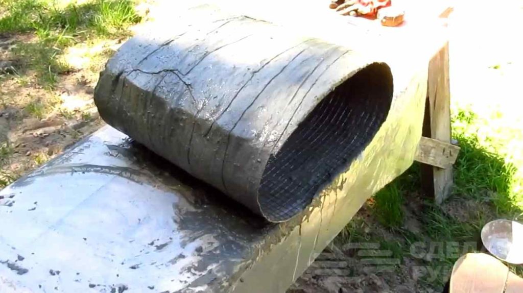 Замешиваем жидкий цементный раствор. Далее отрезаем полосы ткани, окунаем их в раствор и затем оборачиваем вокруг сетки. Оставляем на некоторое время до высыхания раствора.