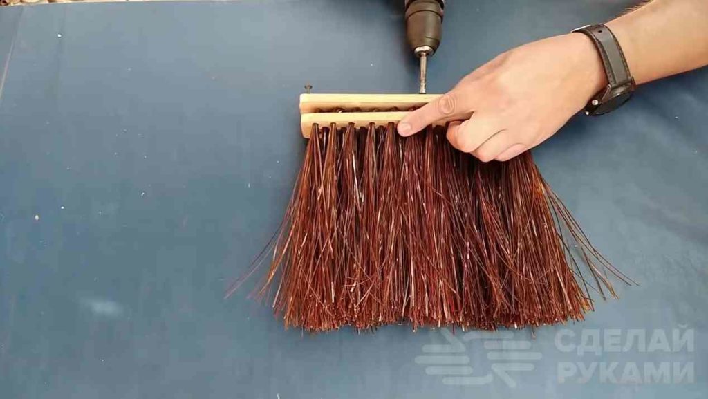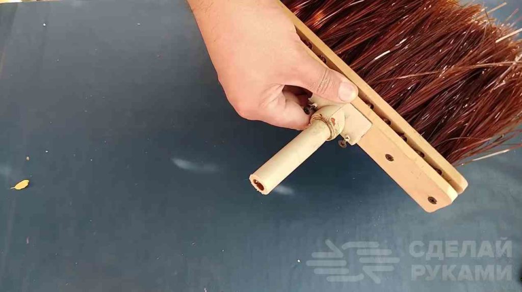На последнем этапе останется только закрепить ручку (автор использует кусок пластиковой трубы), и самодельная метла готова к использованию.
