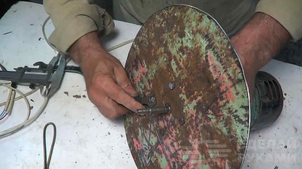 На следующем этапе в вырезанном круге нужно просверлить отверстие под вал двигателя (по центру) и четыре крепежных отверстия, чтобы можно было прикрутить электродвигатель.