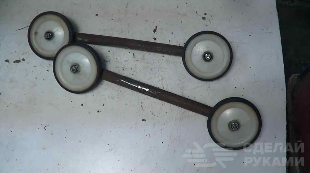 Далее отрезаем два куска круглой трубы, подходящих по длине, и крепим к ним колесики. Свариваем две боковые части основания между собой с помощью еще одного куска круглой трубы. Спереди привариваем платформу с двигателем.