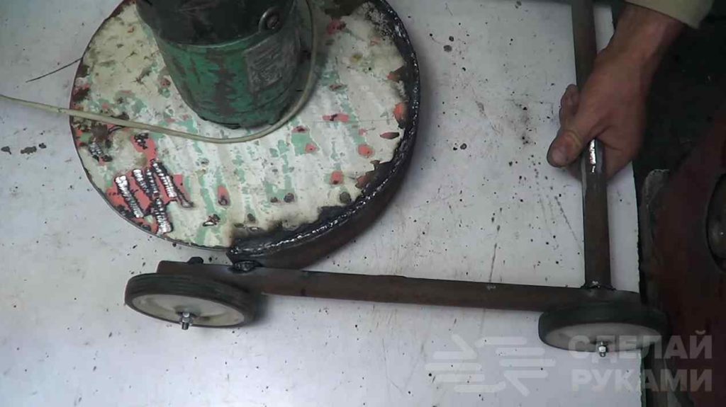 Для удобства к нижней части основания электрической газонокосилки необходимо прикрепить четыре колесика. Сам каркас сварен из круглых труб.