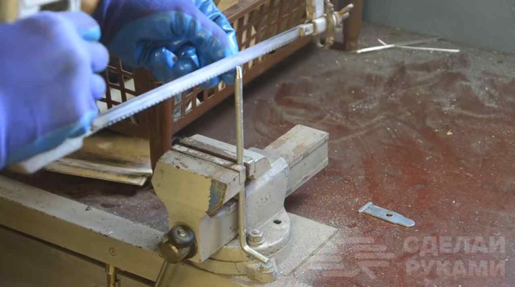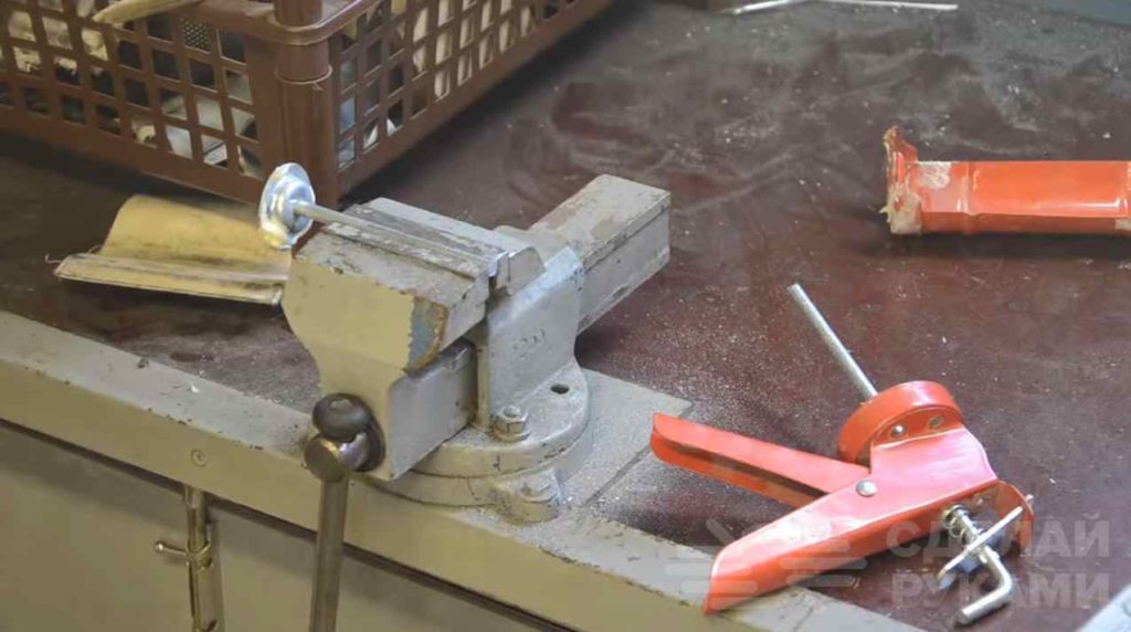 Первым делом зажимаем пистолет для герметика в тиски и с помощью ручной ножовки по металлу отрезаем часть кожуха и шпильки.