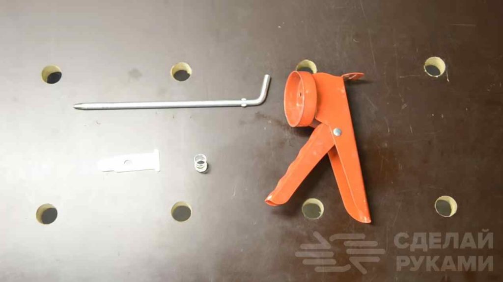 После этого собираем все детали пистолета для герметика в обратном порядке. В корпус с ручкой вставляем фиксирующий элемент с пружиной, а потом вставляем саму шпильку.