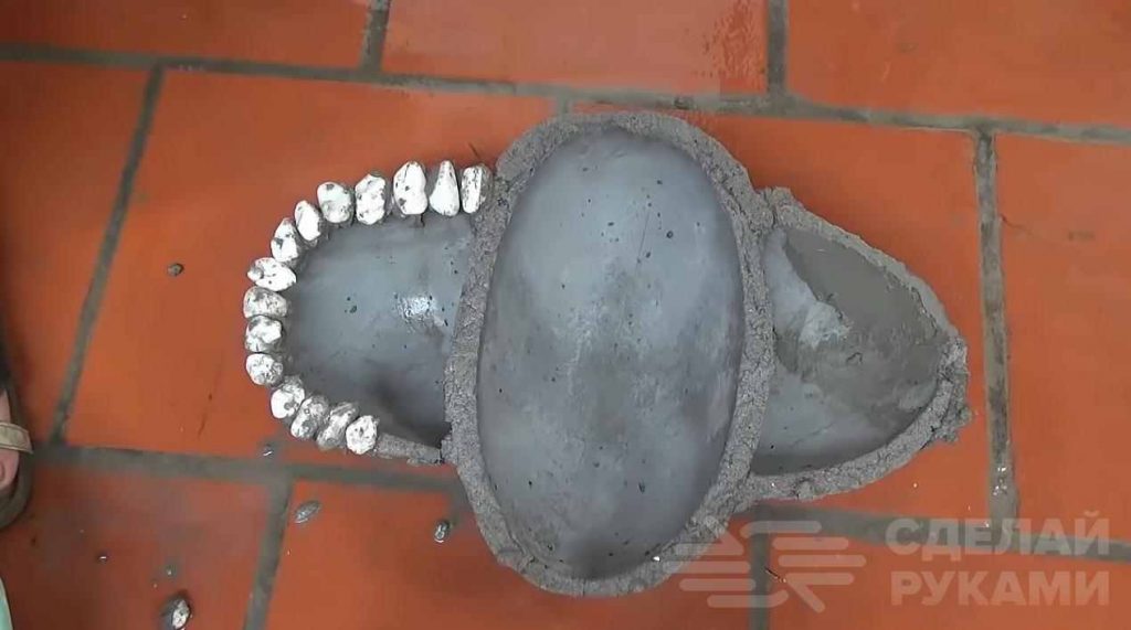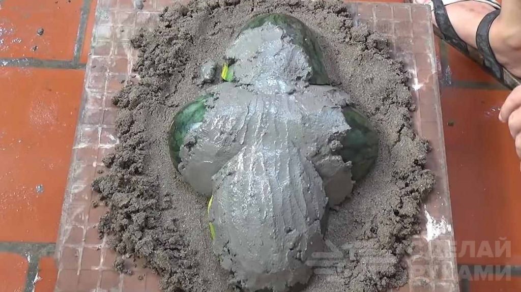 После того, как раствор схватился, арбузные корки необходимо будет аккуратно извлечь. Последний штрих — декоративное оформление. Автор решил просто украсить бетонную «форму» мелкими камешками белого цвета.