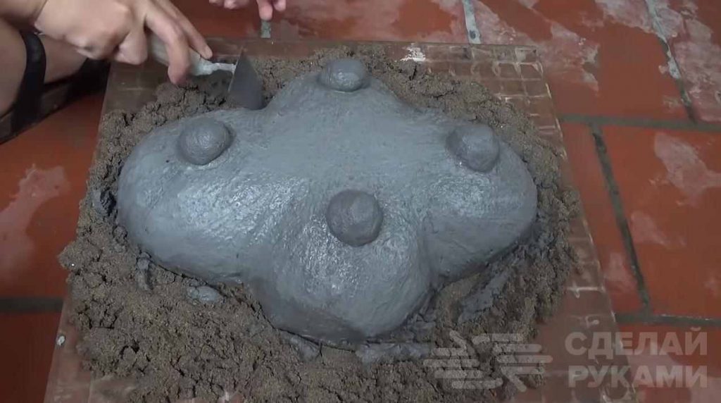 Чтобы основа для пруда устойчиво стояла на поверхности, необходимо будет сделать что-то наподобие ножек. Автор просто «слепил» четыре шарика из цементного раствора, и «приклеил» их по краям формы.