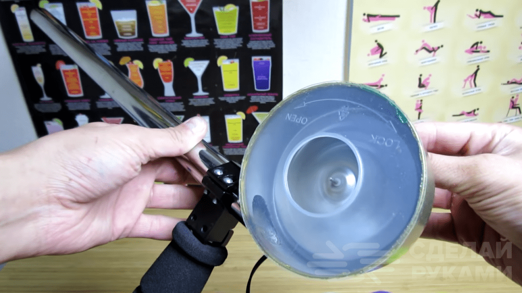 Затем берем металлическую трубку (подойдет трубка от пылесоса). Один конец трубки отрезаем под углом, прикладываем этой стороной к боковой стороне банки, отмечаем контур. Вырезаем отверстие, вокруг которого шлифуем до разметки. Прикладываем трубку и припаиваем ее к банке.