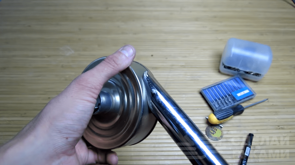 Первым делом берем пустую металлическую консервную банку (например, из-под шпрот), потом отмечаем на дне центр, и делаем аккуратное отверстие круглой формы. В это отверстие с наружной стороны банки нужно вставить миниатюрный двигатель, и прикручиваем его к корпусу тремя болтиками.