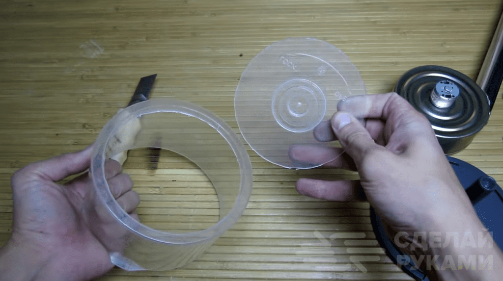 На следующем этапе нужно будет изготовить самодельный вентилятор, который будет нагнетать в трубу воздух. Насаживаем его на электродвигатель – лопасти должны легко вращаться на оси. Затем снимаем прозрачную пластиковую крышку от бокса для хранения дисков. Ножом вырезаем крышку, у которой прорезаем отверстие по центру.