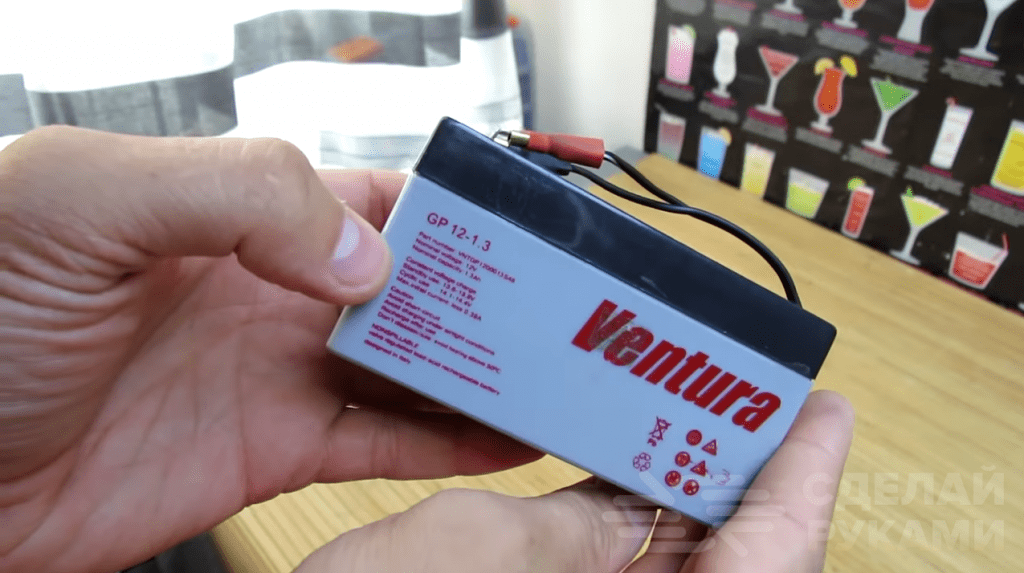 Приклеиваем эту крышку к собранному корпусу воздуходувки. Затем срезаем выступающие части крышки при помощи ножа. После этого подключаем источник питания (в данном случае подойдет свинцово-кислотный аккумулятор на 12V). Такие АКБ используются, например, в бесперебойниках.