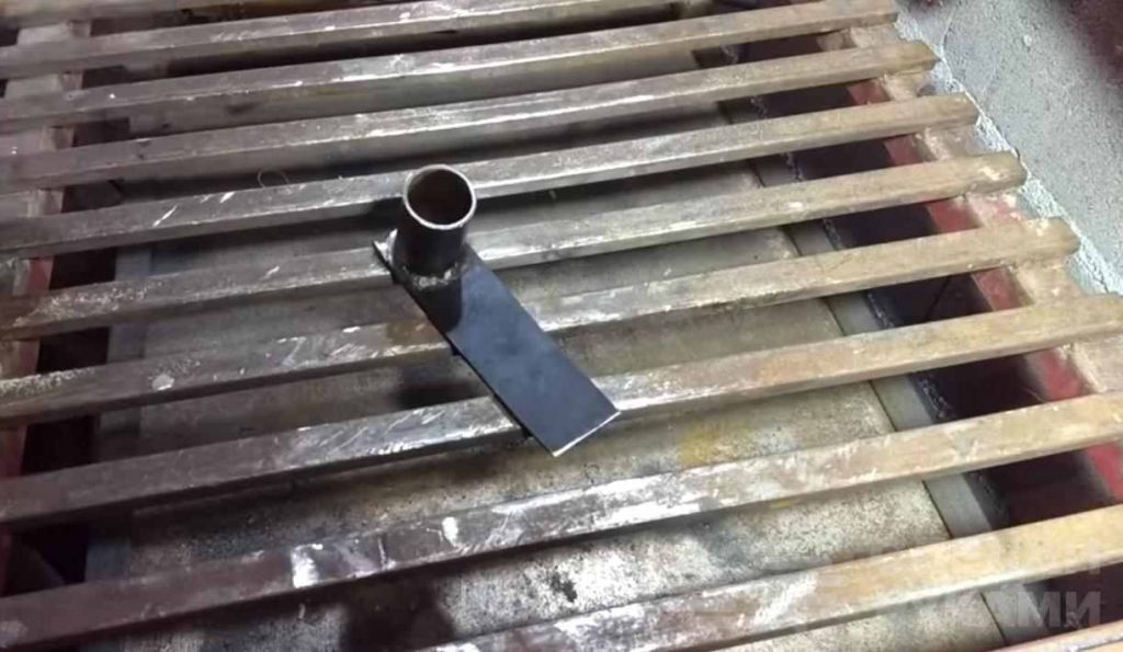 От рессоры отрезаем пластину нужной нам длины и привариваем к ней трубку. Предварительно срезаем трубку под нужный нам угол захода в дерево (почву). Свариваем две детали вместе.