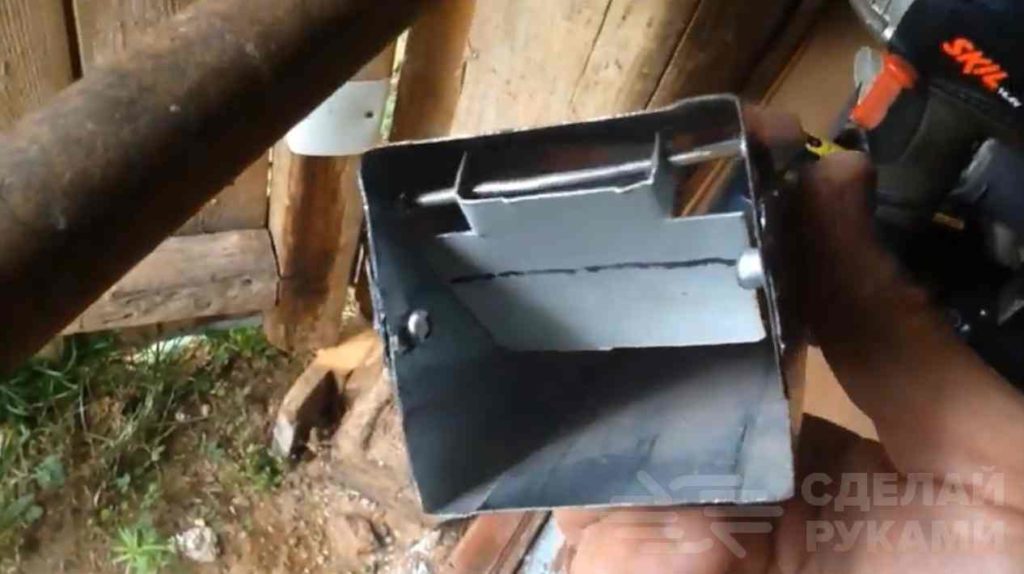 Из куска листового металла автор вырезает квадрат, из которого потом делает дверцу. Для одной ловушки надо сделать две дверца, так как входа два.
