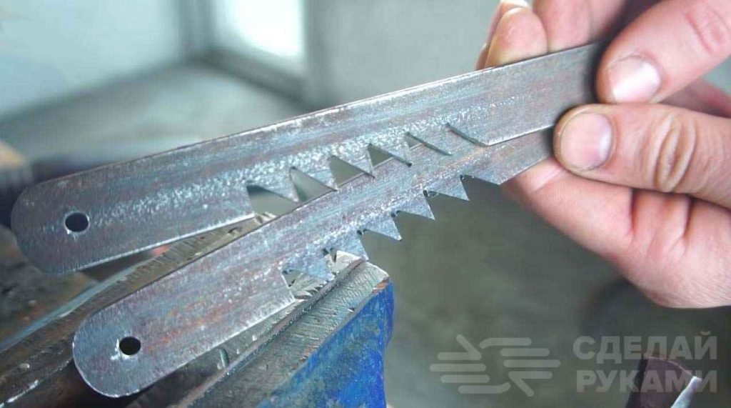 В первую очередь необходимо будет отрезать два куска от полосы металла, и просверлить в них по два отверстия (по краям). Затем нужно с помощью болгарки нарезать на заготовках зубья (примерно посередине).