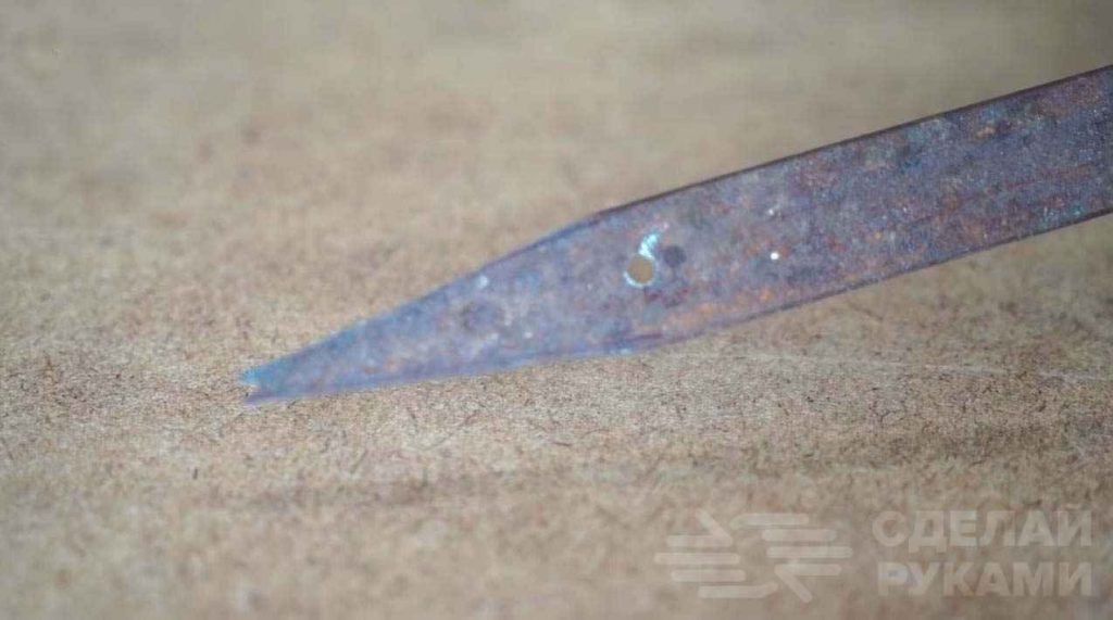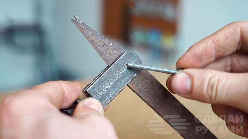 На следующем этапе необходимо отрезать еще один кусок металлической полосы. Один край надо обрезать по форме клина. На конце нужно сделать прорезь болгаркой для проволоки. На некотором расстоянии от края надо просверлить отверстие.