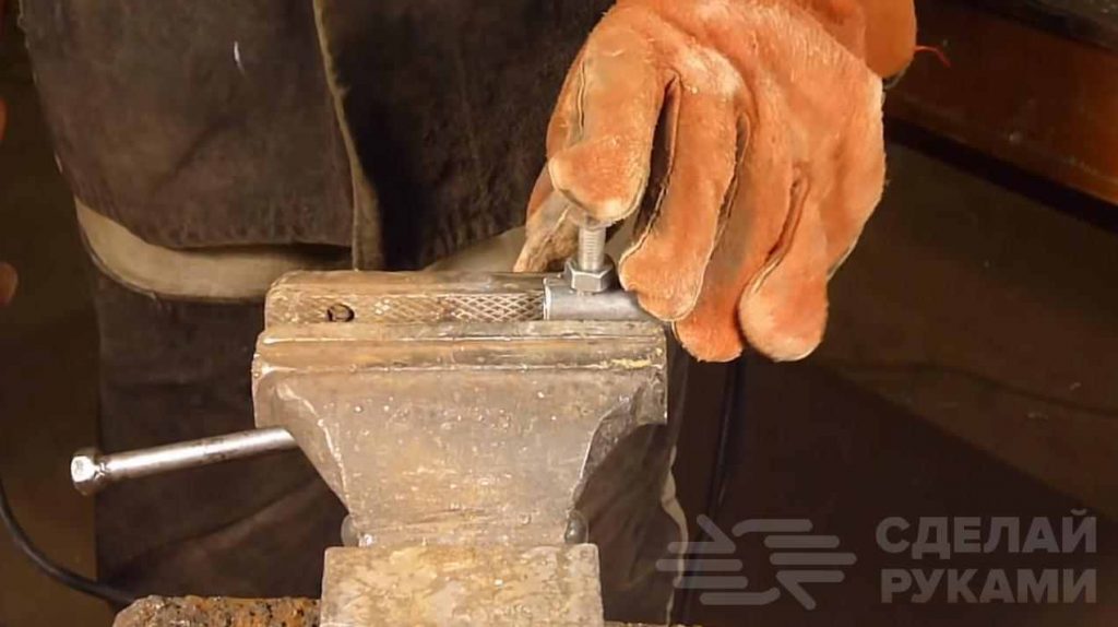 Первым делом необходимо будет отрезать два куска круглой трубы (металлической) и просверлить в них отверстия. Потом мастер вваривает в отверстия гайки (предварительно в них вставляется болт).