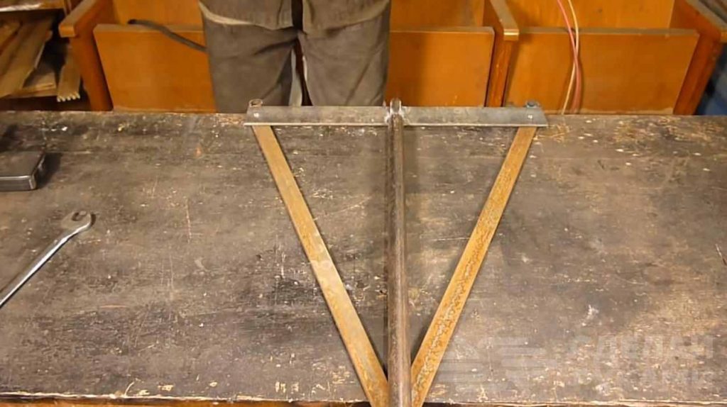 Нижняя часть ручки приваривается к уголку (раме). Потом по краям уголка автор сверлит по одному отверстию. Это нужно для того, чтобы закрепить 2 укосины из металлических полос.