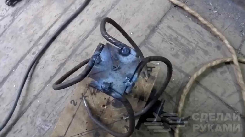 Полученные заготовки автор приваривает к металлической пластине 40х40 мм. И для этого используется самодельный кондуктор, который облегчает задачу.