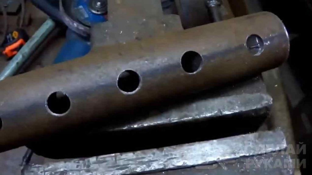 В дюймовой трубе надо просверлить пять сквозных отверстий диаметром 10 мм. В отрезке трехчетвертной трубы необходимо просверлить одно отверстие диаметром 10,5 мм.