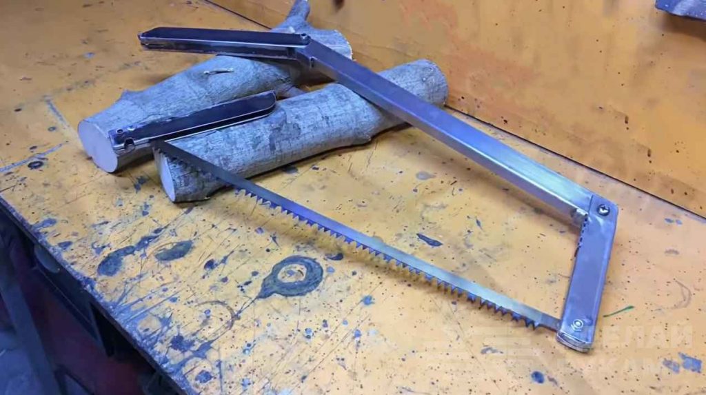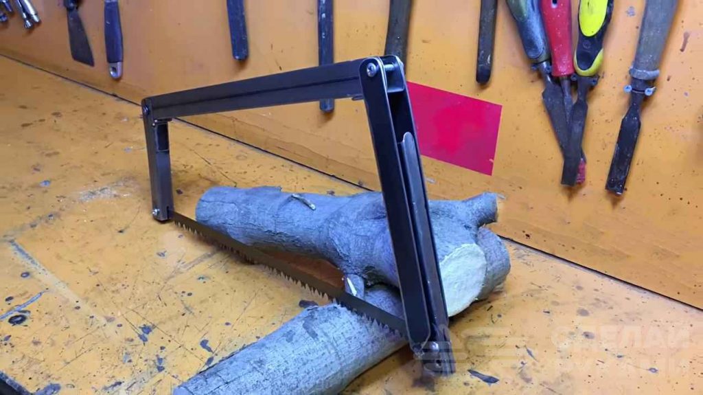 Пила занимает очень мало места и поместится на любой полке или в сумке. Причем самодельная ножовка быстро собирается, и сама натягивается из-за использования эксцентрикового натяжителя на малом и втором профиле.