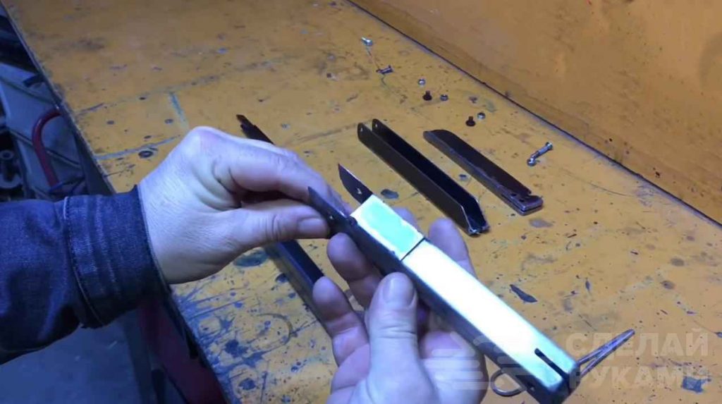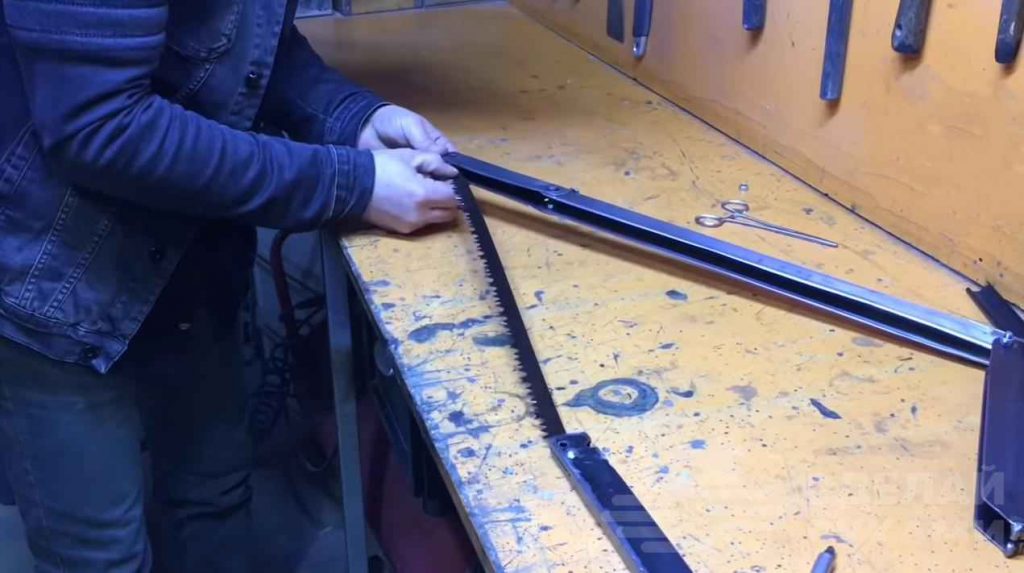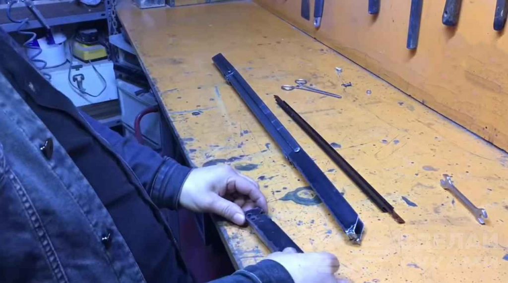 Для начала работы отрезаем кусок профиля 20х30 мм примерно равный длине полотна старой ножовки. Второй профиль должен быть вдвое короче полотна, а последний кусок — на треть короче первого профиля.