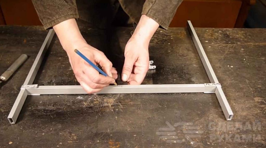 На следующем этапе работ нужно отрезать от алюминиевой профильной трубы заготовки требуемых размеров. Из них надо будет собрать две рамки Н-образной формы. Для скрепления профилей между собой используются полосы из алюминия и заклепки.