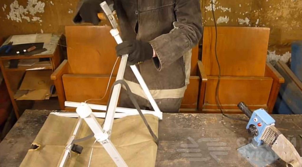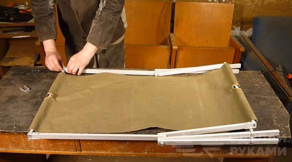 Чтобы при эксплуатации крепежные болты не разбивали края алюминиевой профильной трубы, в тех местах, где просверлены отверстия, нужно вставить куски текстолита. Когда каркас уже собран, натягивается ткань.