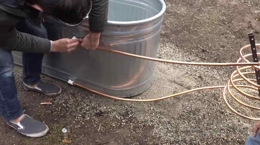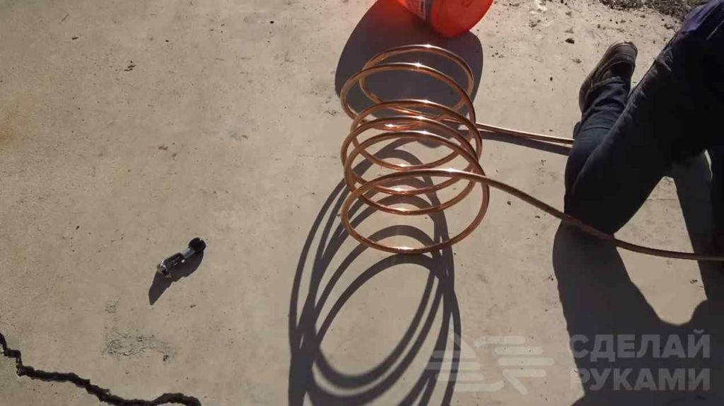 На следующем этапе из медной трубки необходимо будет изготовить змеевик. В оцинкованной емкости сверлим два отверстия в нижней и верхней части, и затем устанавливаем фитинги, в которые вставляем концы змеевика.