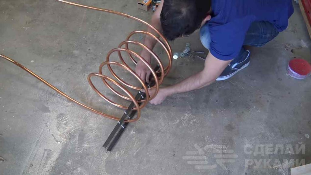 Для жесткой фиксации змеевика автор делает стойку из двух металлических полос, соединенных между собой при помощи болтов с гайками.