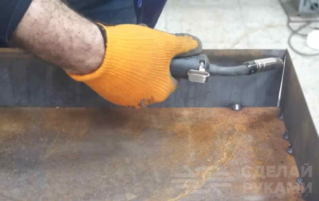Первым делом необходимо будет сварить прямоугольный открытый короб с дном, в котором будут гореть угли. Для этого подойдет листовой металл толщиной примерно 3-4 мм.
