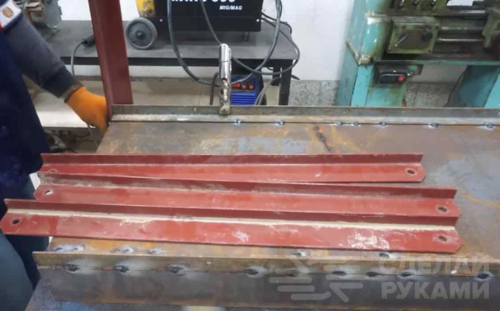 На следующем этапе к этому коробу нужно будет приварить ножки по углам. Их автор решил сделать из строительного уголка, но также в качестве ножек можно использовать, например, профильные трубы.