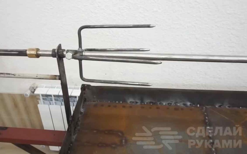 А с другой стороны нужно будет приварить еще одну стойку для фиксации конца стального стержня, на котором будет жариться мясо. Сам стержень изготовлен из нержавеющей трубы.