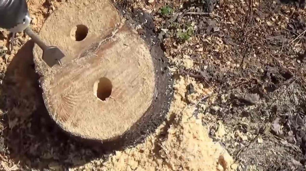 Вам потребуется электродрель и перовое сверло на 25 мм. В пне нужно будет сделать пару отверстия глубиной 12-13 см.