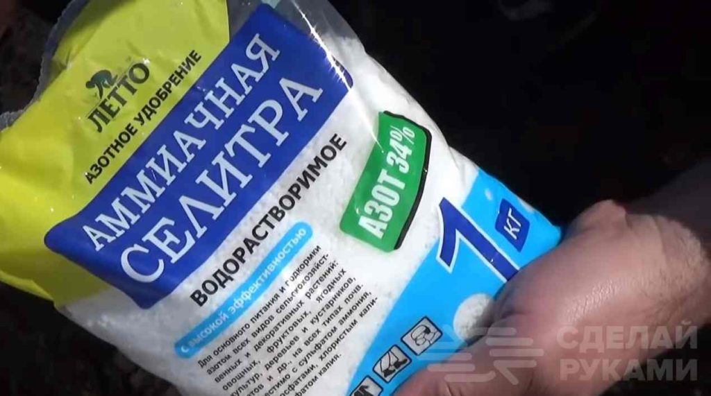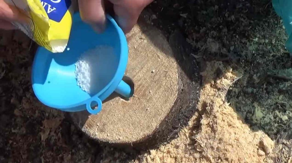 На следующем этапе потребуется аммиачная селитра. Надо засыпать порошок в просверленные отверстия. Для удобства можно использовать воронку.