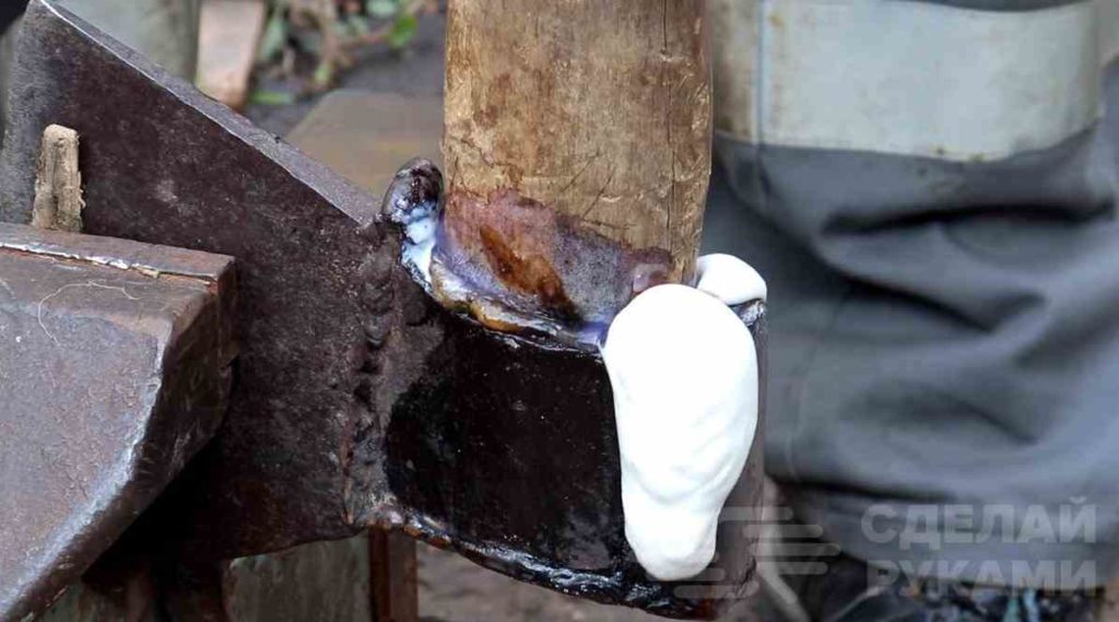 Потом разогреваем слой клея на топорище и вставляем его (топорище) в глухое отверстие в топоре.