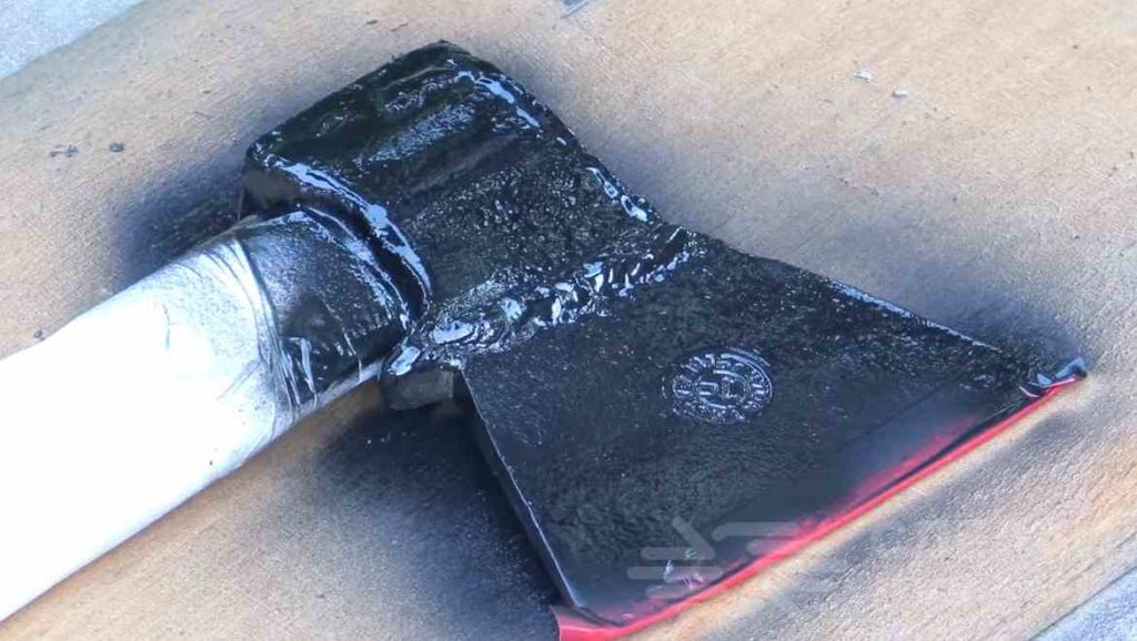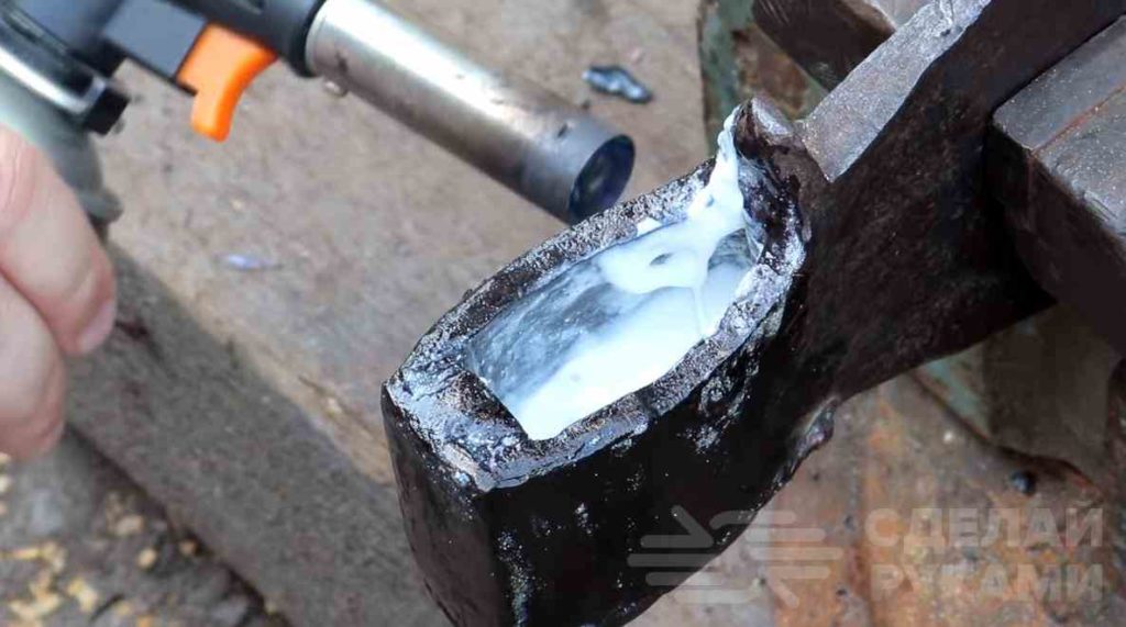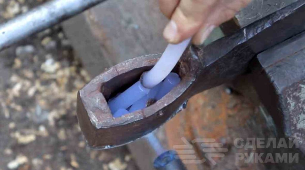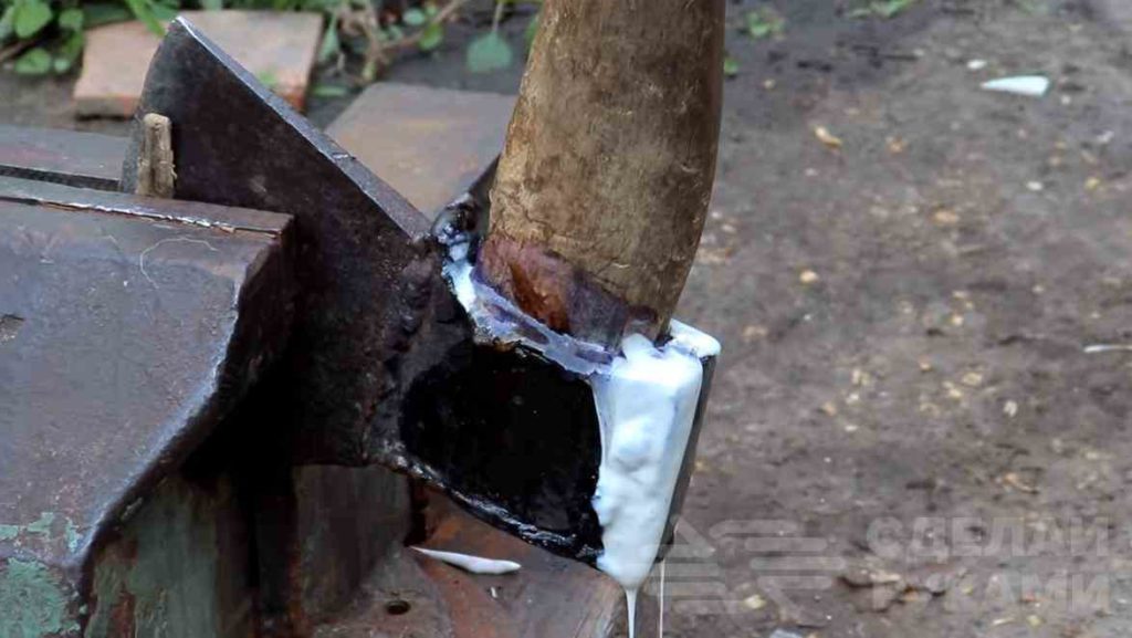 Куски клеевого стержня автор помещает и внутрь топора, и нагревает их горелкой.