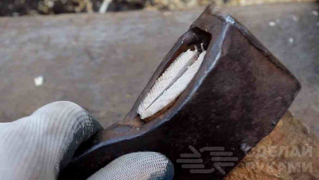 Первым делом автор обрезает топорище таким образом, чтобы его верхний край был заподлицо с верхней частью проушины топора.